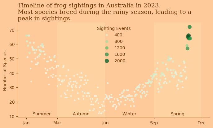 plt.title('Timeline of frog sightings in Australia in 2023. \nMost species breed during the rainy season, leading to a \npeak in sightings.', fontsize=14, fontfamily="Serif", \