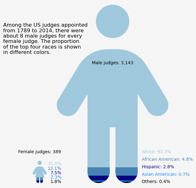 title = f"Among the US judges appointed from {judges_appointments['commission_date'].dt.year.min():.0f} to {judges_appointments['commission_date'].dt.year.max():.0f}, there were about 8 male judges for every female judge. The proportion of the top four races is shown in different colors."