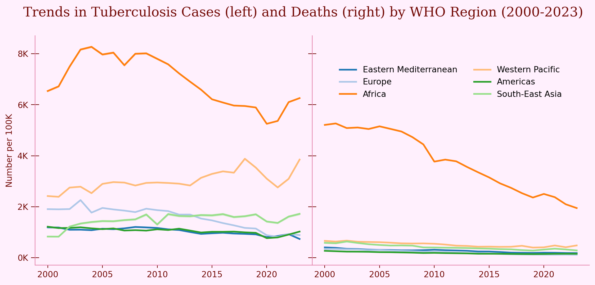 fig.suptitle("Trends in Tuberculosis Cases (left) and Deaths (right) by WHO Region (2000-2023)", color=fg_color, fontsize=16, family='serif')
