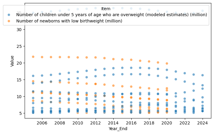 sns.scatterplot(data=food_security_nona_mod2, x='Year_End', y='Value', hue='Item', alpha=0.6)